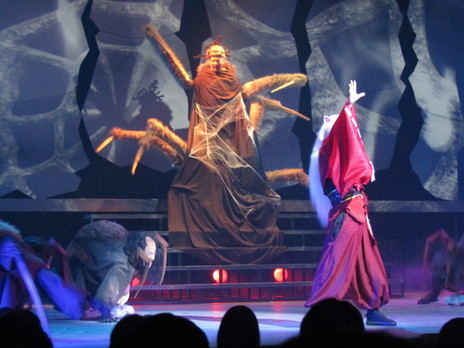 妖怪が出てきたときの演出は舞台装置だけでなくプロジェクトマッピングがうまく活用されており、巨大な妖怪が出てきたときは、舞台全体をグルグルと覆いつくしているかのような表現がされて、迫力満点。