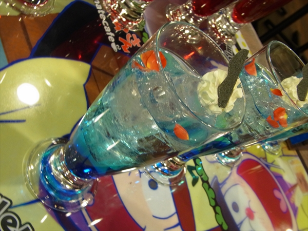 『カラ松ガールズに捧ぐソーダ』は、ブルーキュラソーシロップ+ソーダ+ベルローズ+ホイップクリーム+サングラス型もなか、が合わさったドリンク。とにかく見た目が鮮やかで、味は爽やかなソーダです。これを飲めば、君もカラ松ガールズ&ボーイズだ…!!