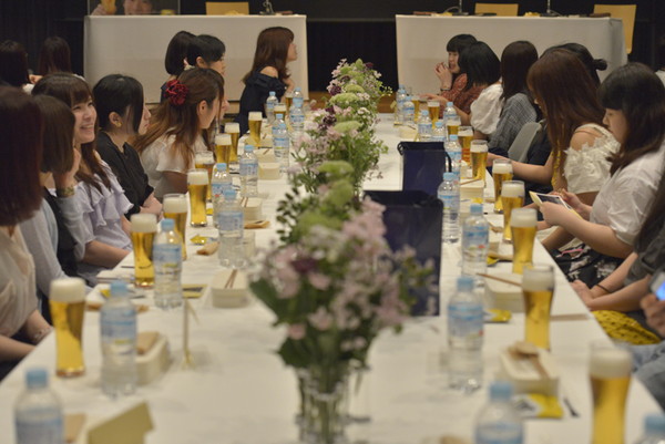 会場には、「プレミアムナイト」のイベント名にふさわしいサントリーのザ・プレミアム・モルツと食事がテーブルに用意され、オープニングで小野は「今日はすごいですね。結婚披露宴のような会場にお集まりいただいて、ありがとうございます」と驚きながら挨拶。