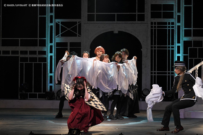 物語は物の怪が当たり前のように存在している、ちょっと不思議な明治にタイムスリップしてしまった綾月芽衣(鈴木桃子)は迷い込んだ鹿鳴館で森鴎外(荒木 宏文)と出逢う。白を基調とした美術にレインボー色のライトが照らされるなか、鴎外、芽衣のほか菱田春草(橋本祥平)、川上音二郎(遊馬晃祐)、泉鏡花(北川尚弥)、藤田五郎(吉岡佑)、小泉八雲(汐崎アイル)、横山大観(橘龍丸)ら出演者が全員で踊るスピード感溢れるオープニングダンスは圧巻の一言。出演者を森の木々に見立てて、道を彷徨いながらも二人が出逢う場面ではこれから始まる鴎外と芽衣の『運命の恋』を予感させる華やかな演出に胸がドキドキすること間違いなし。