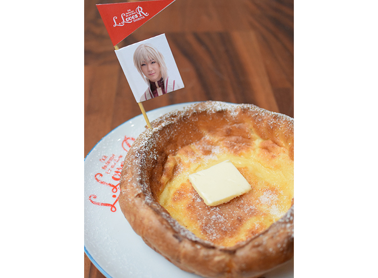 エルラブの人気メニュー。ダッチベイビーパンケーキをシュガーバター味で。殿先生のオリジナルフラグ付き。