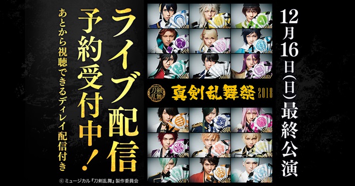 12月16日(日)に行われる“ミュージカル『刀剣乱舞』~真剣乱舞祭2018~”の千葉最終公演が、DMM.comにて劇場からリアルタイムでライブ配信されることが決定した。