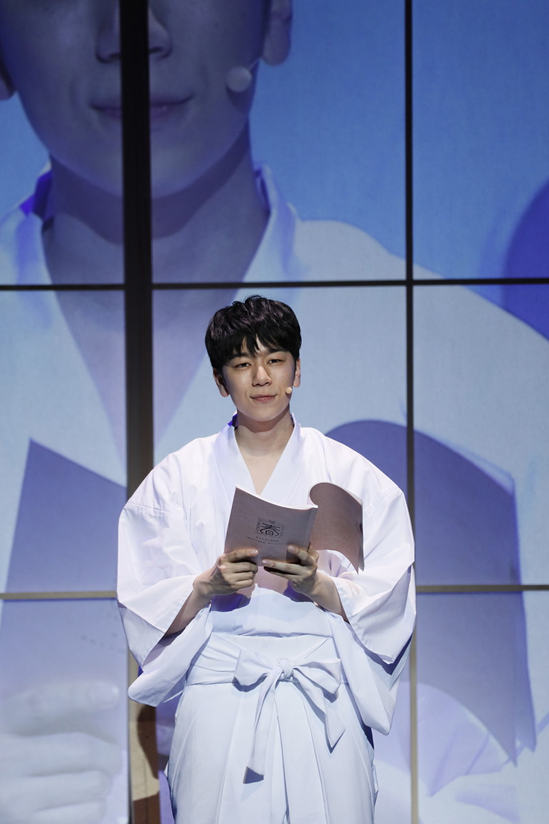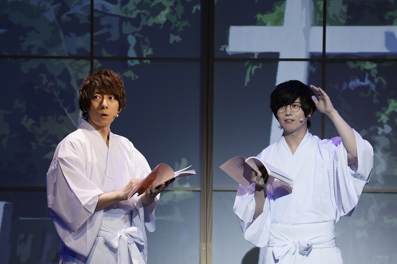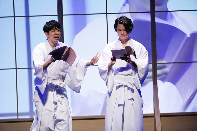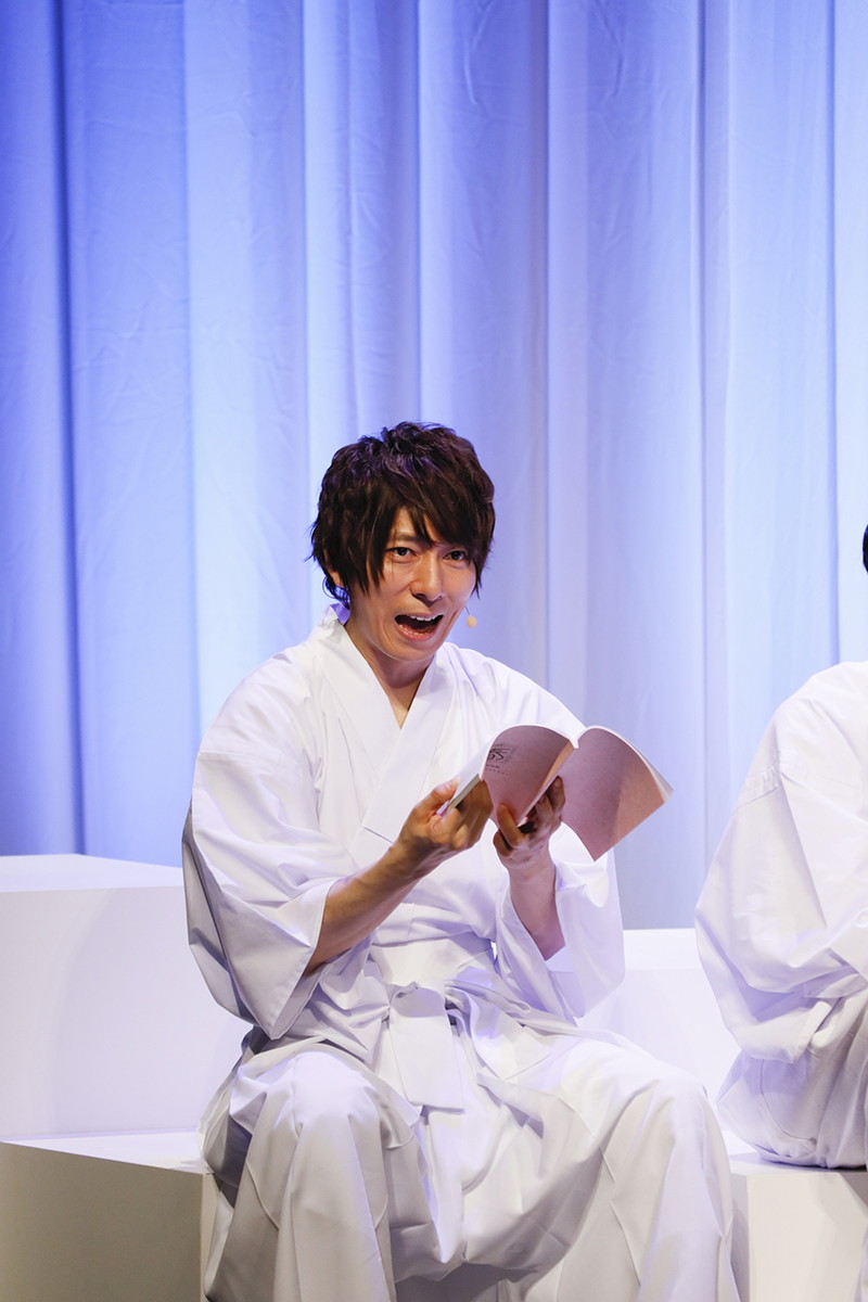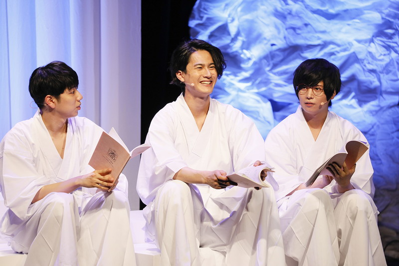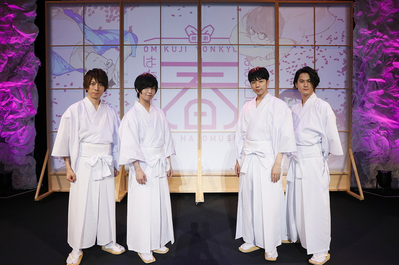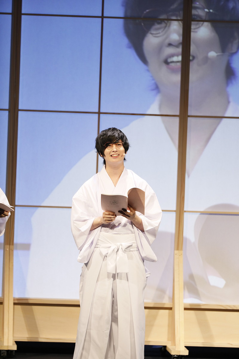 障子を模したスクリーンの向こうから登場し、境内へと誘うような優しい笑みを見せる長男・柊役の羽多野 渉さん。そこへ、弟たちが次々と現れる。次男・文人と同じように赤いフレームのメガネを掛けた斉藤壮馬さん。大好きな猫とのひとときが忘れられない様子の三男・青葉役の西山宏太朗さん。息を切らして駆けつけたのは、四男・志季役の武内駿輔さん。白い袴をまとい、凛とした佇まいの演者たちに、客席からため息がこぼれる。なお、観客は、この神社の名物であるおみくじを引きに来ている参拝客という設定。会場中を見回し、その盛況ぶりに喜ぶ柊たちだった。