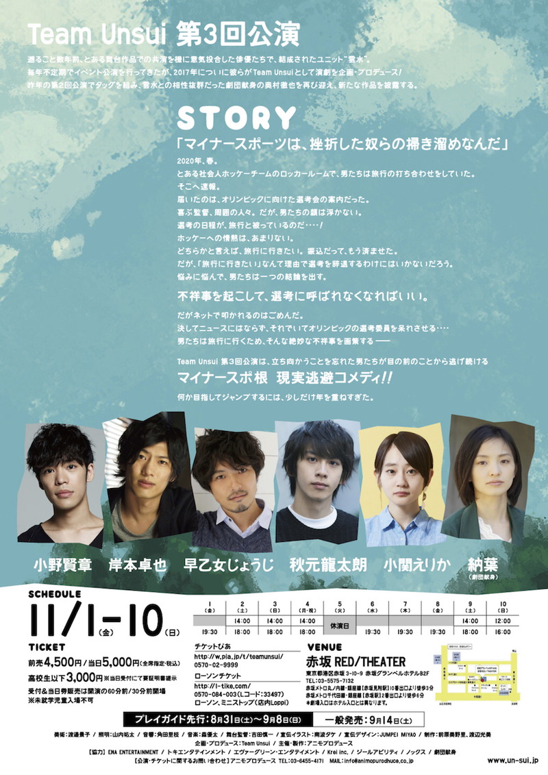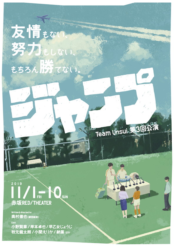 Team Unsui 第3回公演は、立ち向かうことを忘れた男たちが目の前のことから逃げ続ける“マイナースポ根 現実逃避コメディ”!! 何か目指してジャンプするには、少しだけ年を重ねすぎた。