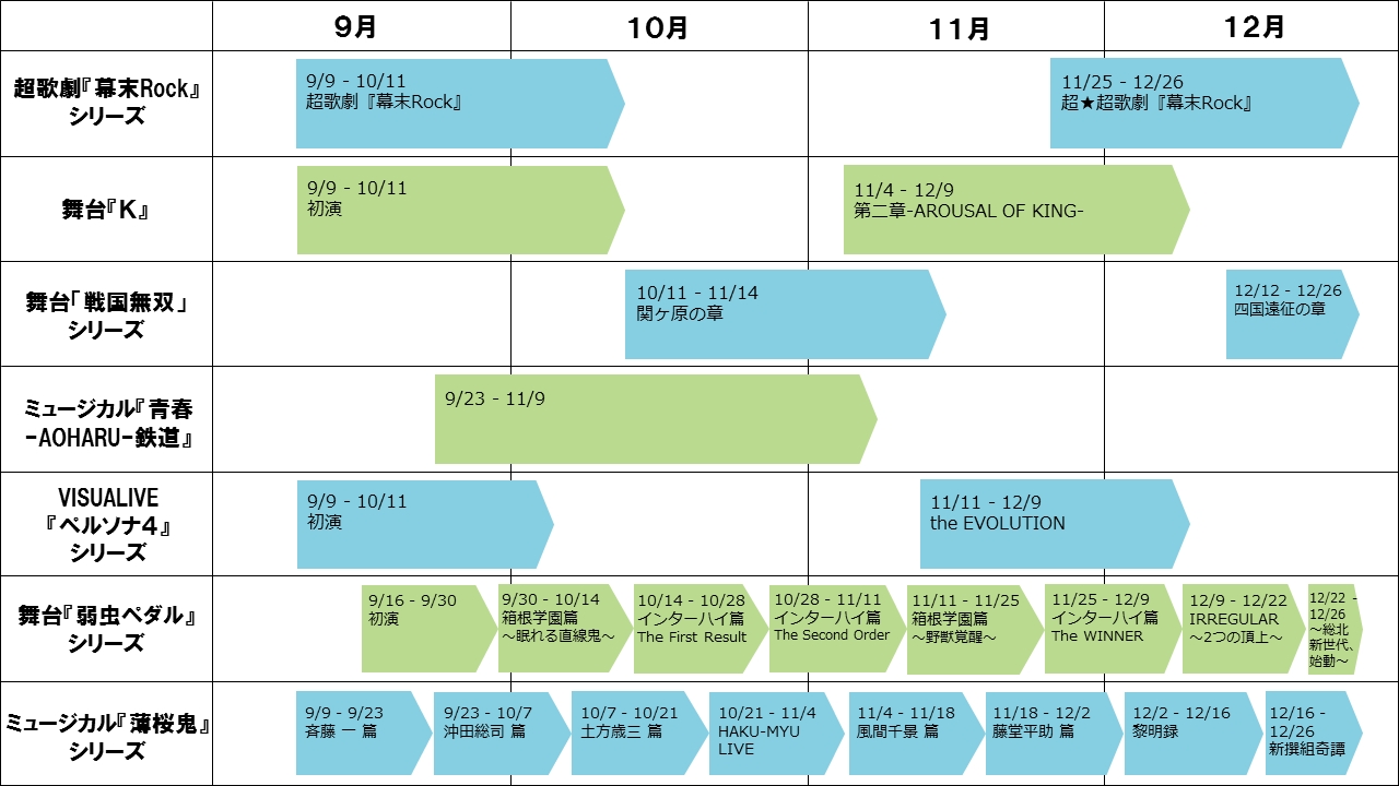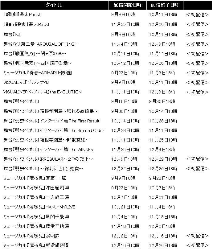 再配信の要望が多かった舞台『弱虫ペダル』シリーズをはじめ、ミュージカル『薄桜鬼』シリーズ、超歌劇『幕末Rock』シリーズやミュージカル『青春-AOHARU-鉄道』、舞台『戦国無双』シリーズ、舞台『K』などdアニメストア初配信の作品まで、注目作品が多数ライナップ。