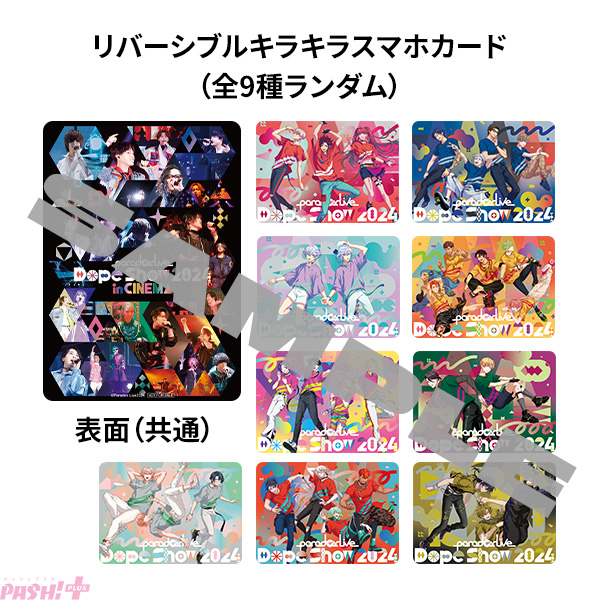 ムビチケ前売券には特典としてリバーシブルキラキラスマホカード(全9種ランダム)が付属。表面は共通でメインビジュアル、裏面には「Paradox Live Dope Show 2024」のチーム別ビジュアルイラストが使用されています(全9種類=BAE、The Cat’s Whiskers、cozmez、悪漢奴等、VISTY、AMPRULE、1Nm8、獄 Luck、武雷管)。ムビチケカードは数量限定ですので、是非この機会をお見逃しなく。