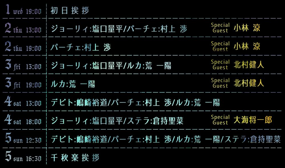 このコラボではステラワースの店内にオフショット写真が展示されるほか、2月12日(日)には握手会も開催される。握手会にはデビト役・嶋崎裕道、パーチェ役・村上 渉、ルカ役・荒 一陽、ステラ役・倉持聖菜の参加が決定。全員と握手できるのに加えて、希望したキャストからチケットを渡してもらえるのでファンの皆さんはお楽しみに。