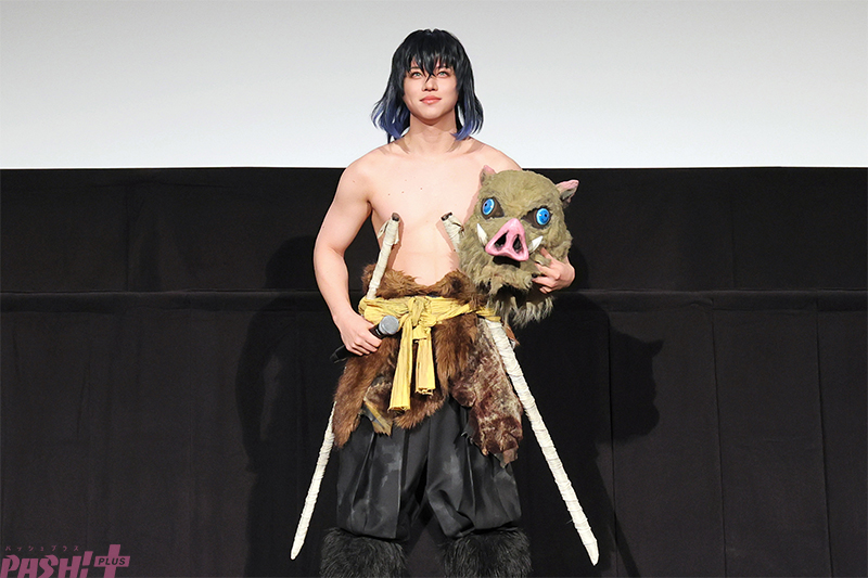 役衣裳で舞台挨拶に登場した竈門炭治郎役:阪本奨悟・髙橋 颯(W キャスト)、竈門禰豆子役:髙橋かれん、嘴平伊之助役:佐藤祐吾、鬼舞辻無惨役:佐々木喜英とともに、会場中がスクリーンに注目するなか、早速新情報をふくむスポット映像が流れる。