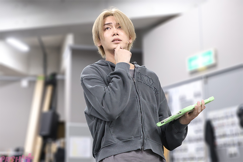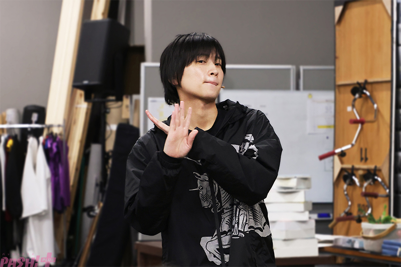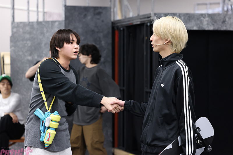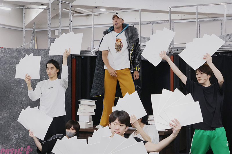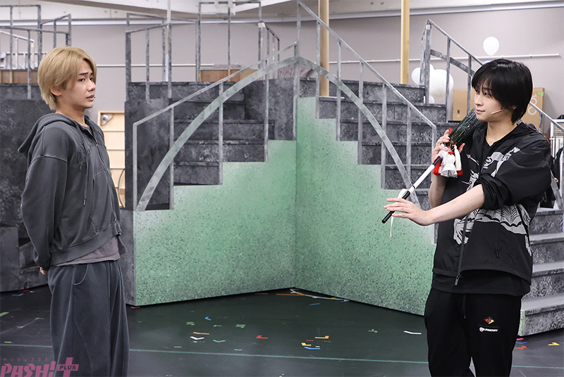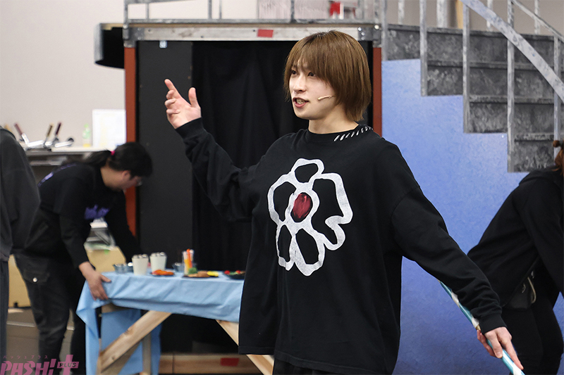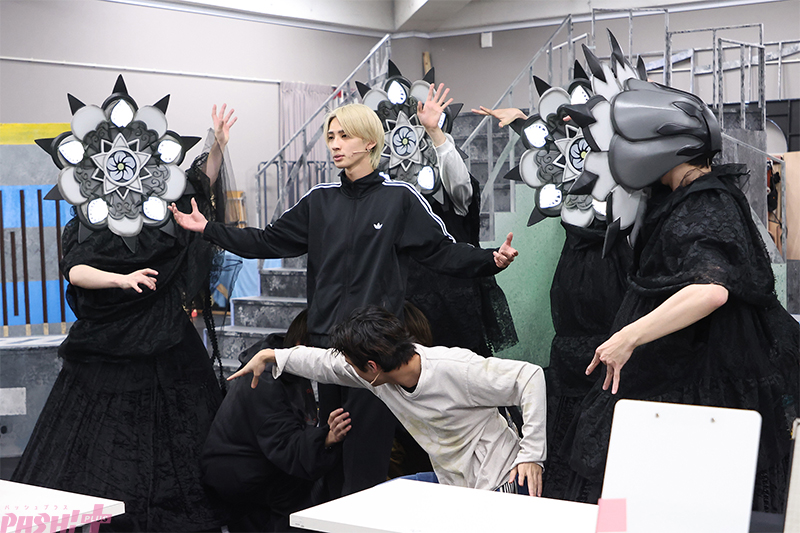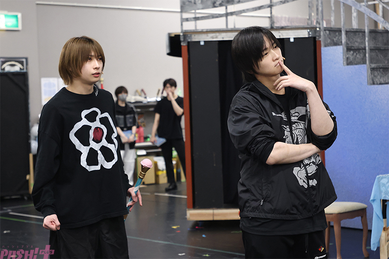 おなじみのオープニングナンバーで赤・青の大陸の物語が懐かしく思い出されたのち、場の空気が一気に黒の大陸へと切り替わる。自由度の高いキャラクターたちがそろった本作では、これまで以上に多彩な個性が際立つ。バッドばつ丸王国のバドバルマを演じる當間は、肩にかけた本番用の衣裳のマントがサマになっていた。「アニキ」と慕われる頼もしさを見せる一方、主(ロード)に翻弄される姿には思わずクスリと笑ってしまう可愛らしさもある。楽曲面ではレゲエやラップの要素も取り入れられ、稽古場は一時クラブハウスのような大人な雰囲気に。自席で見守るキャストたちも自由に歓声と拳をあげて楽しんでいた。